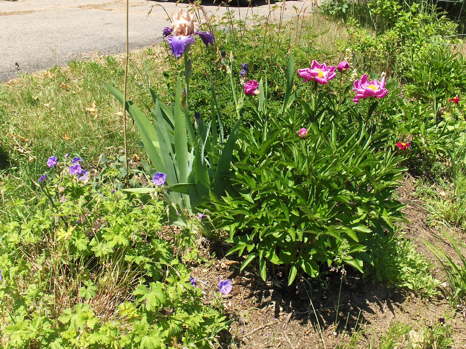 Here in the bed beside the driveway, a peony blossomed today. And just behind is a gorgeous iris with one bloom out and four more waiting to pop. I love the intricate flower of iris and these two-toned ones are simply beautiful.